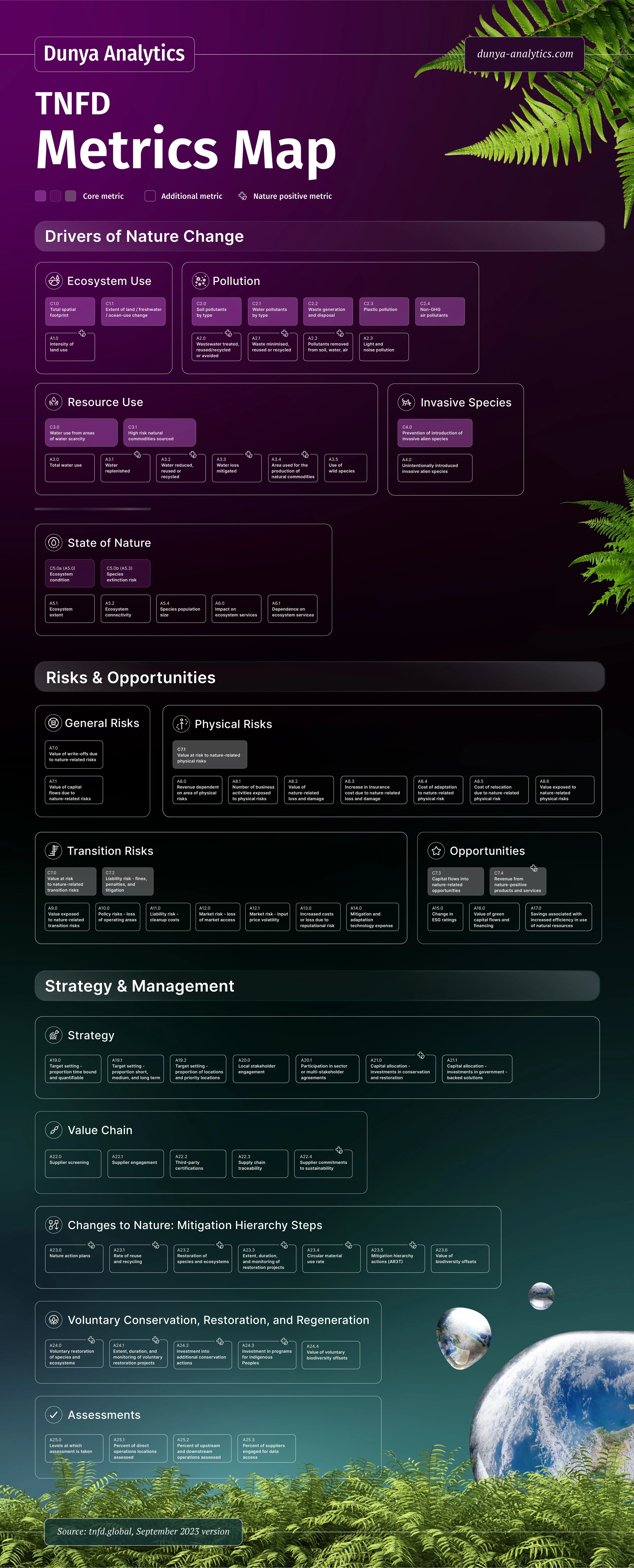 The landscape of nature risk disclosures recommended by the Task Force for Nature-related Financial Disclosures (TNFD) can be difficult to navigate, so we have created this TNFD Metrics Map to help you visualize them more easily. Core metrics (applicable to all sectors) and additional metrics (many of which highlight ‘nature positive’ work) are grouped and categorized according to the TNFD guidance.
