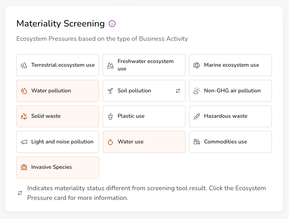The materiality screening identifies material ecosystem pressures based on the SBTN screening tool. This step is recommended by the TNFD.